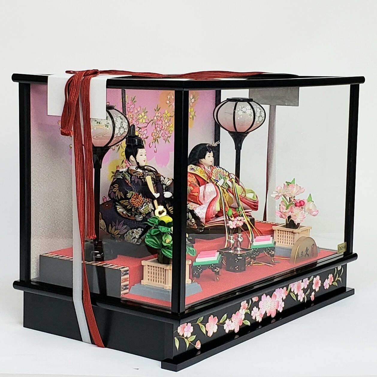 桃の節句 ひな人形 人形の久月 ケース飾り 親王 桜金彩バック 黒塗桜金彩枠 オルゴール付き 69663f12