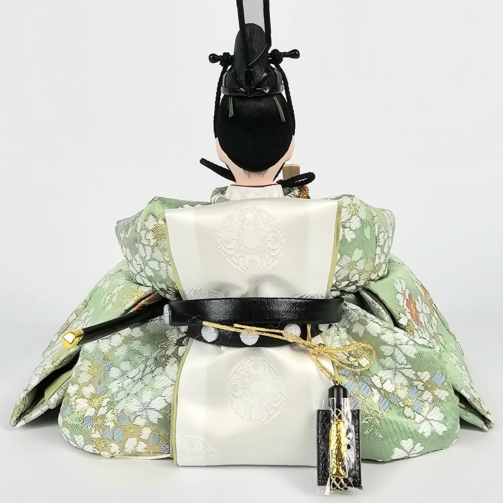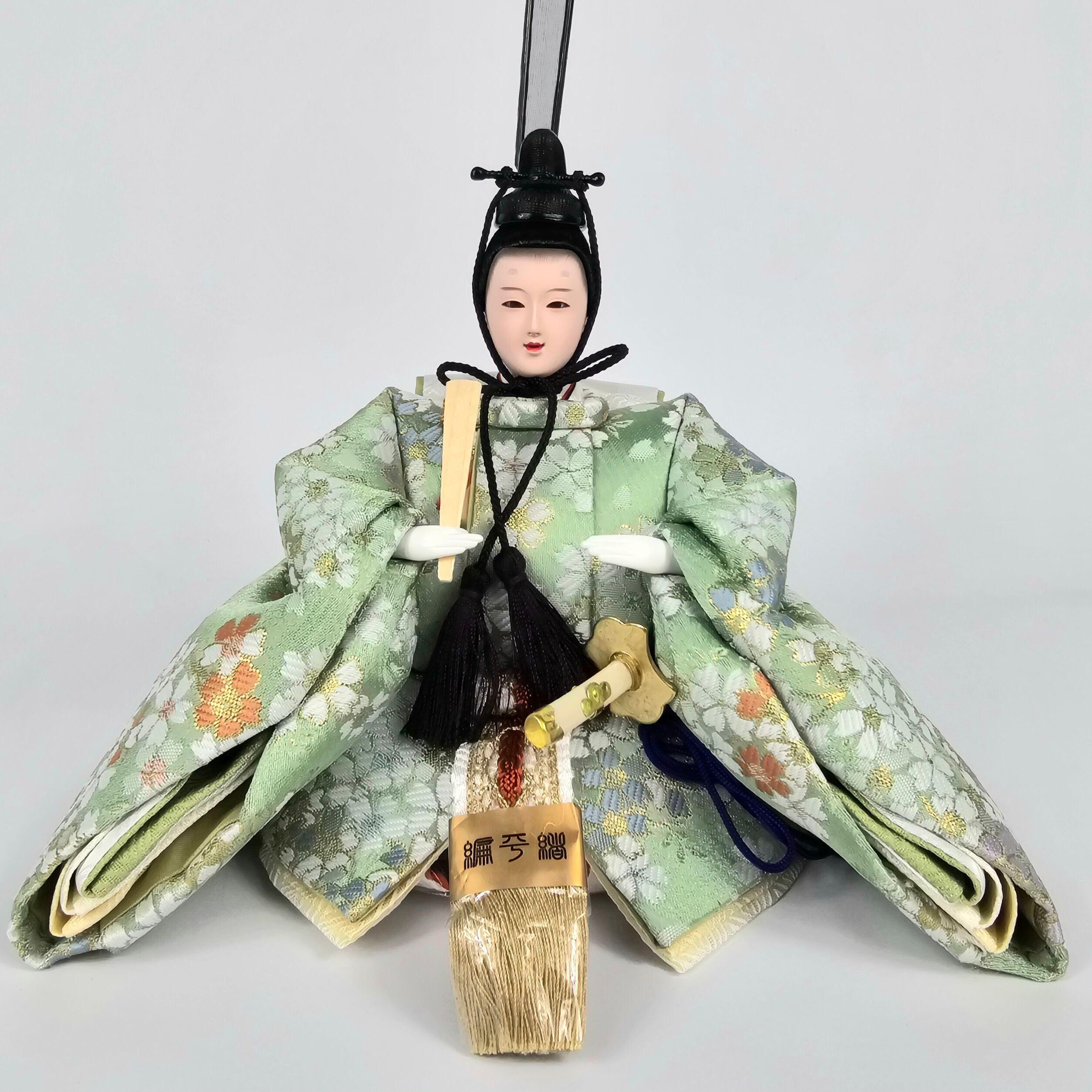 お人形は非常に小さなサイズながらも、上品な色合いの衣裳を着せ付けています。